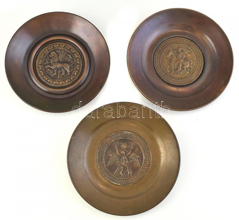 3 db bronzplakettel díszített réz fali dísztál, kopásnyomokkal, d: 26 ...