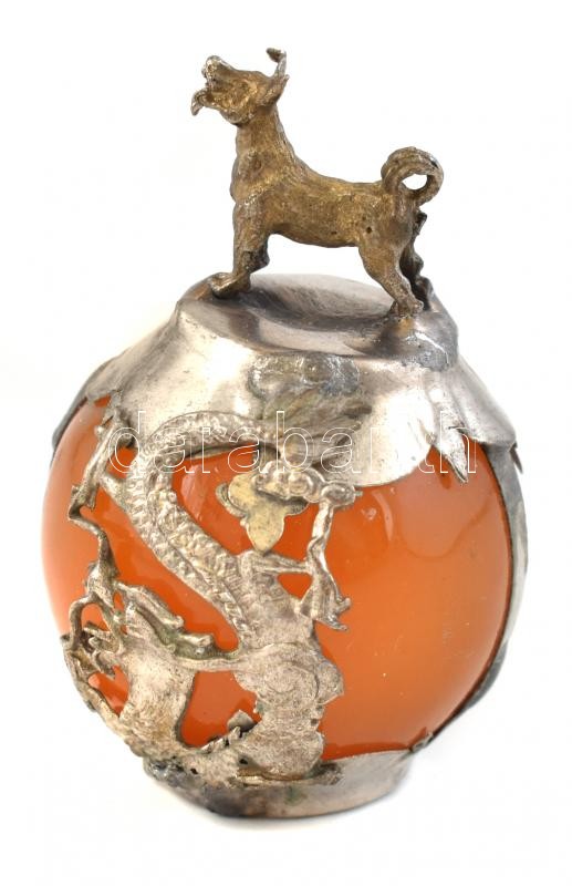 Fém kutya figura borostyán színű gömbön., m: 5 cm