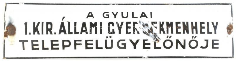 a gyulai M. Kir. Állami gyermekmenhely telepfelügyelőnője zománc tábla sérült 10x40 cm