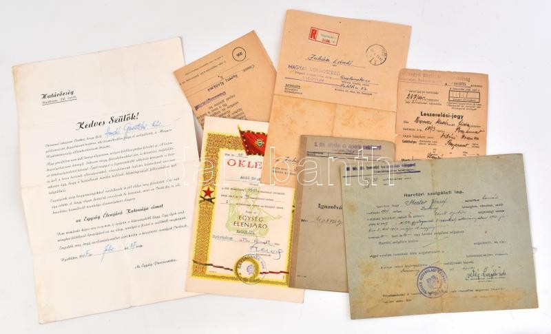 7 klf katonai okmány, nyomtatvány, köztük igazolványi lap, leszerelési jegy stb.