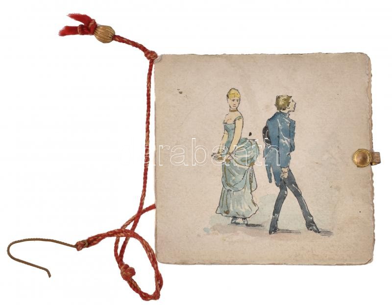 1901 Táncrend, négyzet alakú füzet illusztrált borítóval, részben ceruzával kitöltve, akasztóval, 8x8 cm
