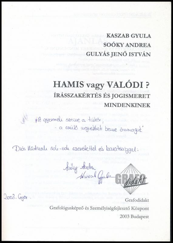 Kaszab-Soóky-Gulyás: Hamis vagy valódi? (írásszakértés és jogismeret mindenkinek). Dedikált! Bp., 2003. Grafo. Kiadói papírkötésben
