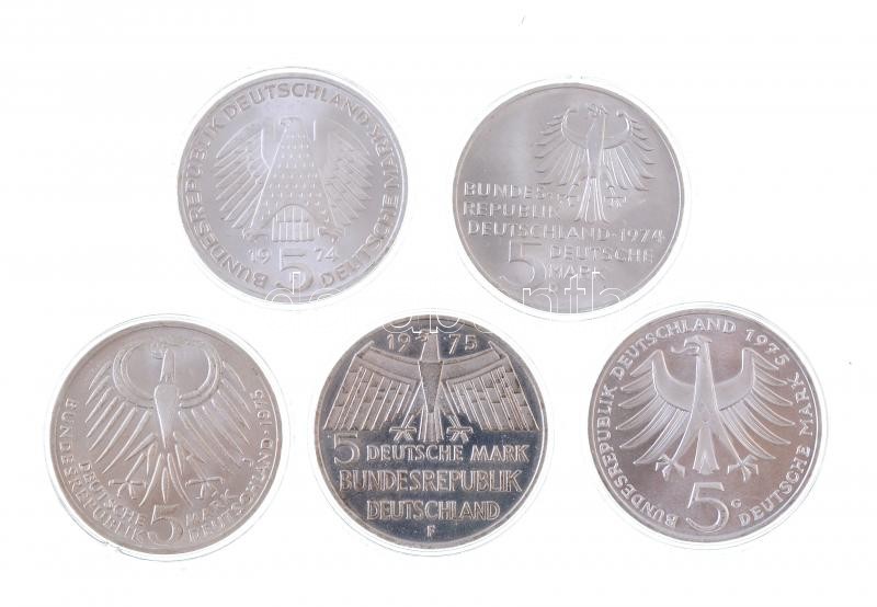 NSZK 1974-1975. 5M Ag (5xklf) emlékkiadások tanúsítványokkal T:1,1- FRG 1974-1975. 5 Mark Ag (5xdiff) commemorative issues with certificates C:UNC,AU