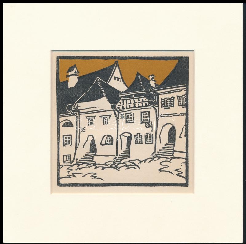 Kós Károly (1883-1977): Utcakép, színes linómetszet, papír, jelzés nélkül, paszpartuban, 12×11 cm