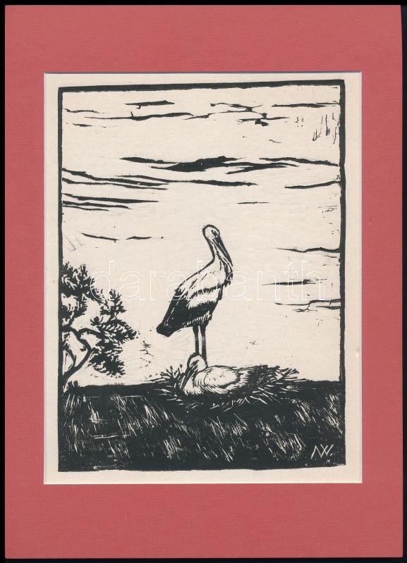 Nagy Vince (1939-): Gólyafészek. Linó, papír, jelzett a linón, paszpar...