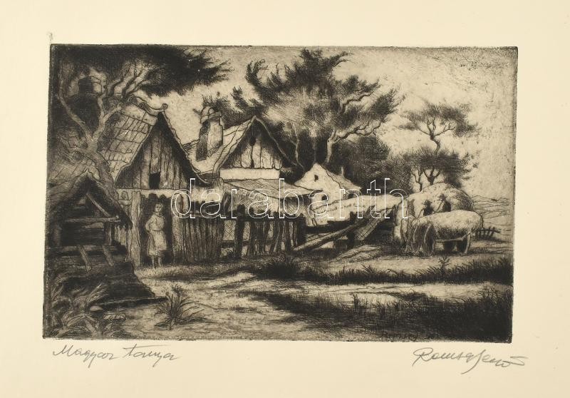 Remsey Jenő (1885-1970), 3 db rézkarc: Présházak. Rézkarc, papír. Jelzett. 19,5x29. + Magyar tanya. Rézkarc, papír. Jelzett. 29x19 cm + Folyópart Szentendrén. Színezett rézkarc, papír. Jelzett. 29,5x38,5 cm. Mindegyik lap széle kissé foltos és sérült, mind feltekerve, tokban.