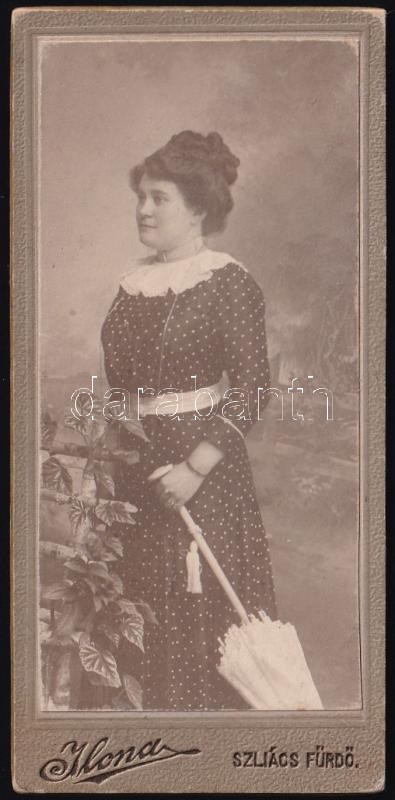 cca 1910 Hölgy napernyővel, keményhátú fotó Ilona szliácsfürdői műterm...