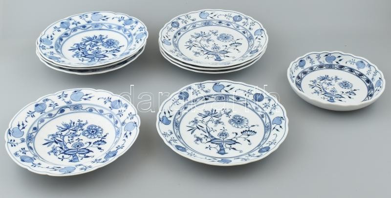 Description: Meissen (7db) és MZ Austria (2db) össz 9 db vegyes tányérok, porcelán, mázalatti kobaltkék hagymavirág mintával, jelzett: csillagos Meissen és MZ Austria, hibátlan, d:20 és 25 cm között