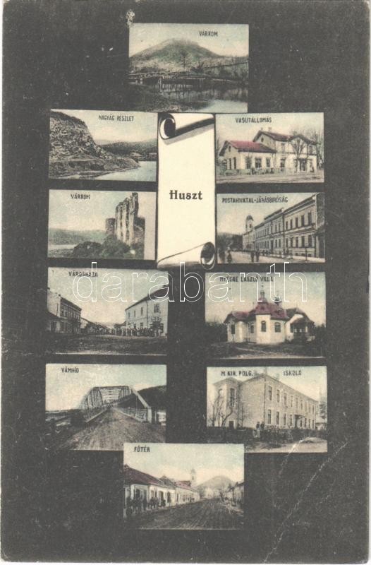 1916 Huszt, Chust, Khust; várrom, Nagyág részlet, vasútállomás, Postahivatal, Járásbíróság, Városháza, Nyegre László villa, vámhíd, M. kir. polgári iskola, Fő tér / castle ruins, riverside, railway station, post office, district court, town hall, villa, customs bridge, school, main square (EB)