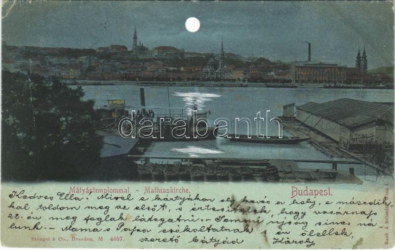 1899 Budapest V. Esti látkép Mátyás templommal, gőzhajó, rakpart (r)
