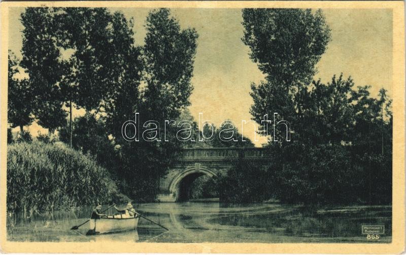 1936 Békés, Körös-parti részlet, híd, csónakázók. Végh Lajos kiadása