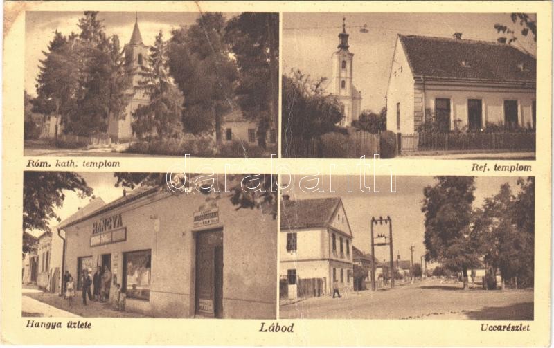 1942 Lábod, Római katolikus templom, Református templom, utca, Hangya szövetkezet üzlete és saját kiadása (fa)