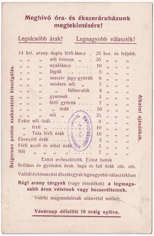Description: Budapest IV. Újpest, Magyar Kereskedelmi Hitelszövetkezet, Nasser Testvérek órás és ékszerészek üzlete, Wéb. Árpát út 34. (saját ház), Selle Károly fényképész. Hátoldalon árlista (non PC)