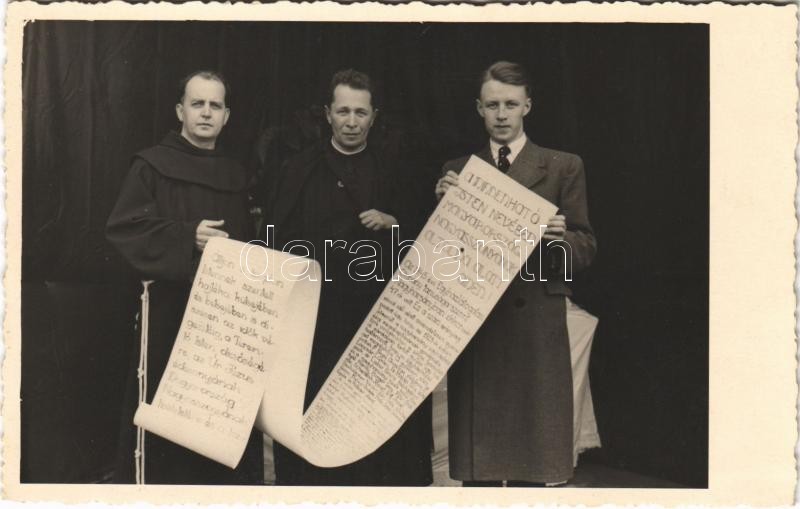 Description: Nagyharsány, Plébániatemplom alapító okirata dr. Hajós György tb. kanonok, Menráth Cyprián plébános és Peller Károly a templ. ép. biz. titkára. Zsabokorszky mérnök felvétele, photo