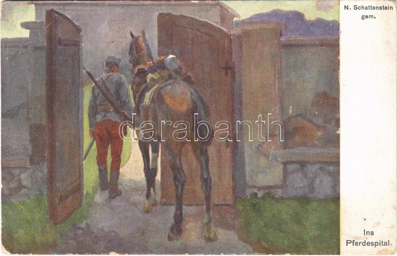 Description: Im Pferdespital / WWI Austro-Hungarian K.u.K. military art postcard, at the horse hospital. Offizielle Karte für Rotes Kreuz, Kriegsfürsorgeamt, Kriegshilfsbüro Nr. 274. s: N. Schattenstein (kopott sarkak / worn corners)