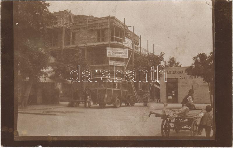 Description: ~1910 Érsekújvár, Nové Zamky; Kossuth Lajos tér, Oczvirk Rajmund gyógyszertára, épülő ház Dukesz és Albert Oestereicher megnyíló üzleteinek reklámjával, autóbusz / square, pharmacy, shops, construction, autobus. photo