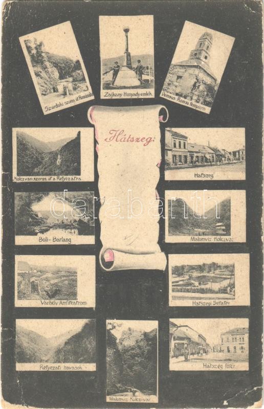 1906 Hátszeg, Hateg; Szurduki szoros, út Romániába, Hunyadi emlék (Zajkány), Római templom (Demsus), Kolczvári szoros, út a Retyezátra, Boli-barlang, Amfiteátrum (Várhely), Kolcz vár (Malomvíz), sétatér, fő tér, Retyezáti havasok. Kendoff és fia kiadása / Pasul Surduc, road to Romania, monument (Zaiceni), Catholic church (Densus), gorge, road to Retezat, amphitheatre (Sarmizegetusa), castle (Rau de Mori), promenade, main square, shops (EB)