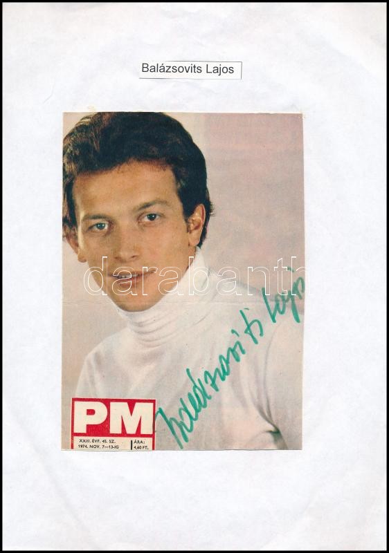 Balázsovits Lajos (1946-) Balázs Béla-díjas magyar színész aláírása az őt ábrázoló újságkivágáson