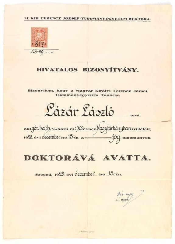 1928 JOgi doktori avatás hivatalos bizonyítványa. Szegedi Tudományegye...