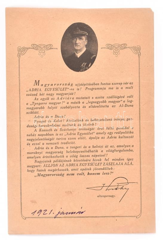 1921 Horthy Miklós Adria Egyesületbe való belépésre buzdító beszéde