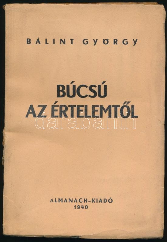 Bálint György: Búcsú az értelemtől. Bp., 1940., Almanach. Kiadói papír... https://www.darabanth.com/en/402-Online-auction/402.0/Books/Books-Other-rarities~1500019/Balint-Gyorgy-Bucsu-az-ertelemtol-Bp-1940-Almanach-Kiadoi-papirkotes-a-gerincen-sC3~II2475776