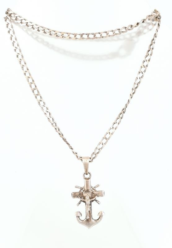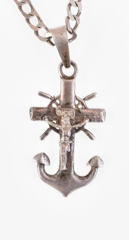 Ezüst (Ag) nyaklánc, hajókormányt és horgonyt formázó feszület medállal, jelzett, kisebb kopásnyomokkal, 3,5x2 cm, nettó: 21,3 g