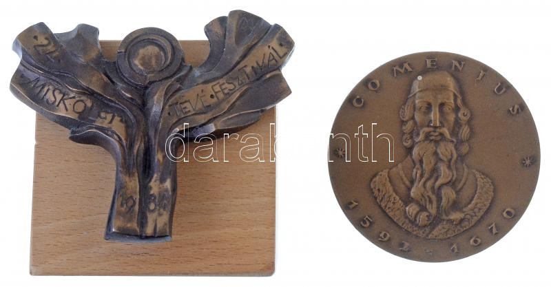 1984. "Miskolci Tévéfesztivál 1984" egyoldalas Br plakett, fa talpon (75x88mm) + DN "Comenius 1592-1670 - Illustris Schola Sáros-Patachina (Sárospatak)" kétoldalas Br emlékérem (70mm) közös, nem eredeti tokban T:2