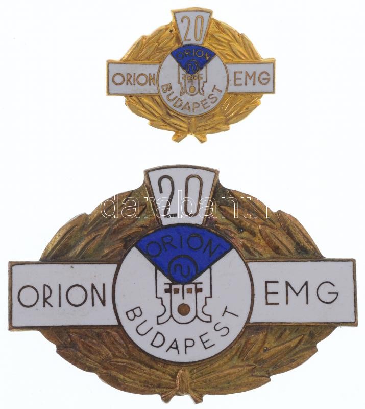 ~1970. "Orion EMG 20 éves Törzsgárda" zománcozott Br plakett (50x33mm) + zománcozott miniatűr jelvény sérült tokban T:1-