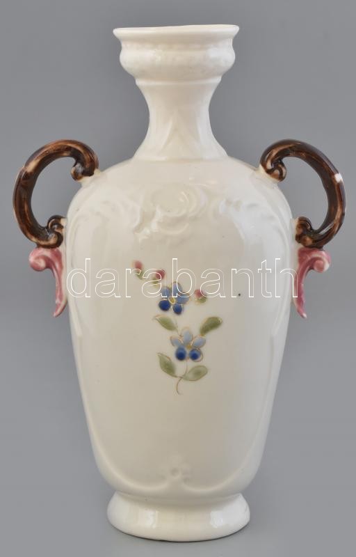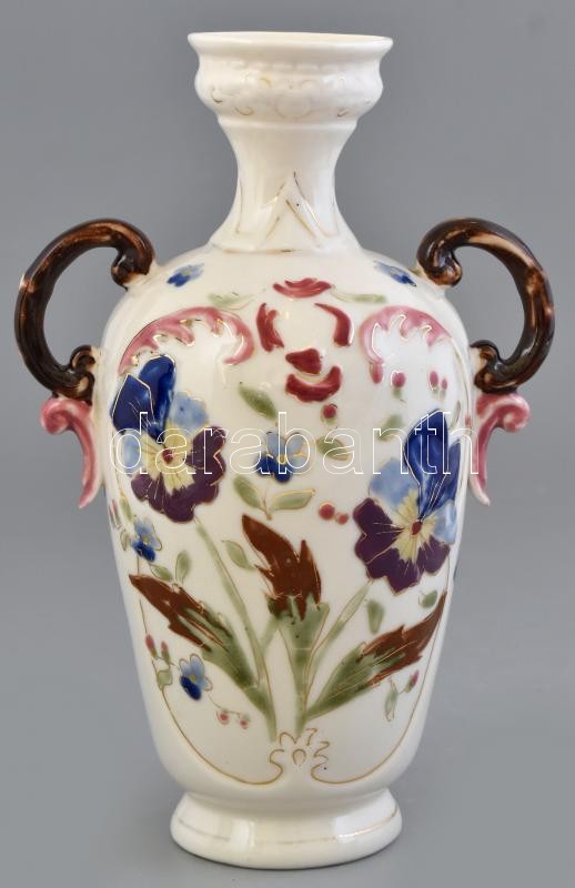 Szecessziós díszváza, kézzel festett, aranyozott porcelán, jelzett, kopott, m: 23cm