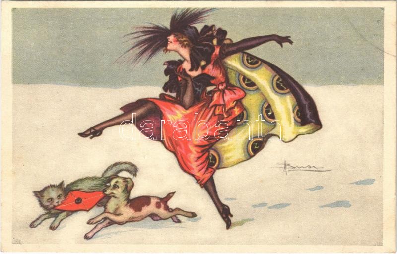 Divatos hölgy kutyával és macskával. Olasz művészlap / Italian Art Deco postcard. Anna e Gasparini 562-2. s: Busi