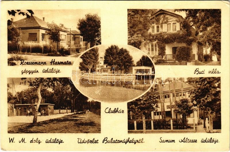 Balatonújhely (Siófok), Roessemann-Harmatta gépgyár üdülője, Buci villa, Clubház, W.M. dolgozók üdülője, Samum Altesse üdülője (EK)
