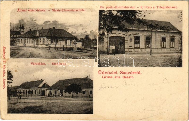 Description: 1902 Sasvár, Mária Sasvár, Maria-Schlossberg, Sastín (Sasvár-Morvaőr, Sastín-Stráze); Állami elemi iskola, városház, kir. posta és távirda hivatal. Emánuel J. kiadása / school, town hall, post and telegraph office