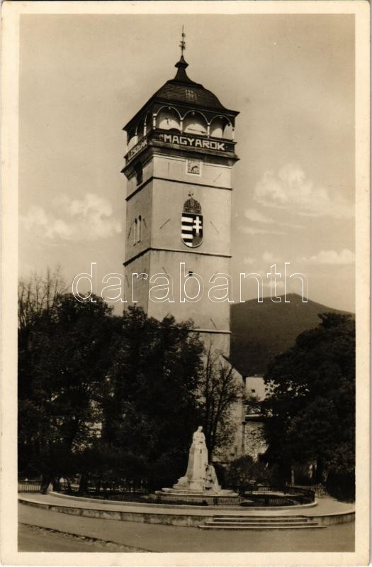 Description: Rozsnyó, Roznava; Gróf Andrássy Dénesné szobra a várostoronnyal, irredenta felirattal és magyar címerrel. Fuchs József kiadása / statue, monument, Hungarian coat of arms and irredenta propaganda, watchtower
