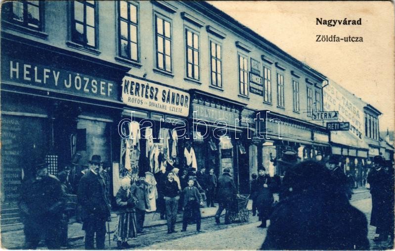 Nagyvárad, Oradea; Zöldfa utca, Helfy József, Kertész Sándor rőfös és ...