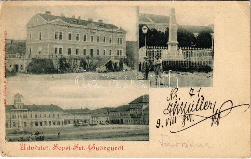 Sepsiszentgyörgy, Sfantu Gheorghe; Állami polgári leányiskola, Fiú árvaház, 1848-as szabadságharc hősi emlékoszlopa, üzletek. Benkő M. kiadása / girls school, shops, boy orphanage, 1848-49 Hungarian Revolution Heroes' monument, obelisk (EK)