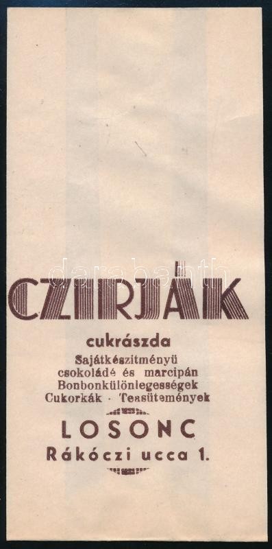 cca 1930 Losonc, Czirják cukrászda cukorkás zacskó 16 cm