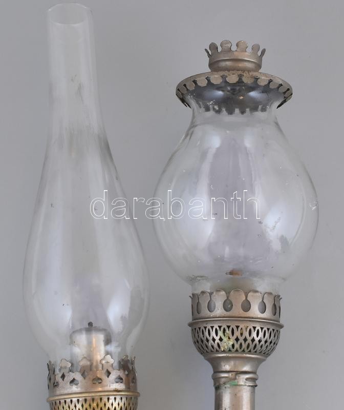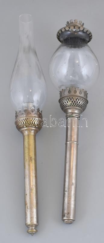 2 db fém fáklya üveg búrával. Hiányos, sérült, h: 41 és 45 cm