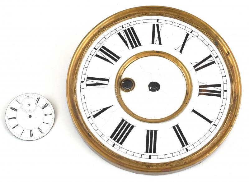 2 db zománc óra számlap, sérülésekkel, a nagyobbik réz kerettel. d: 4 ...