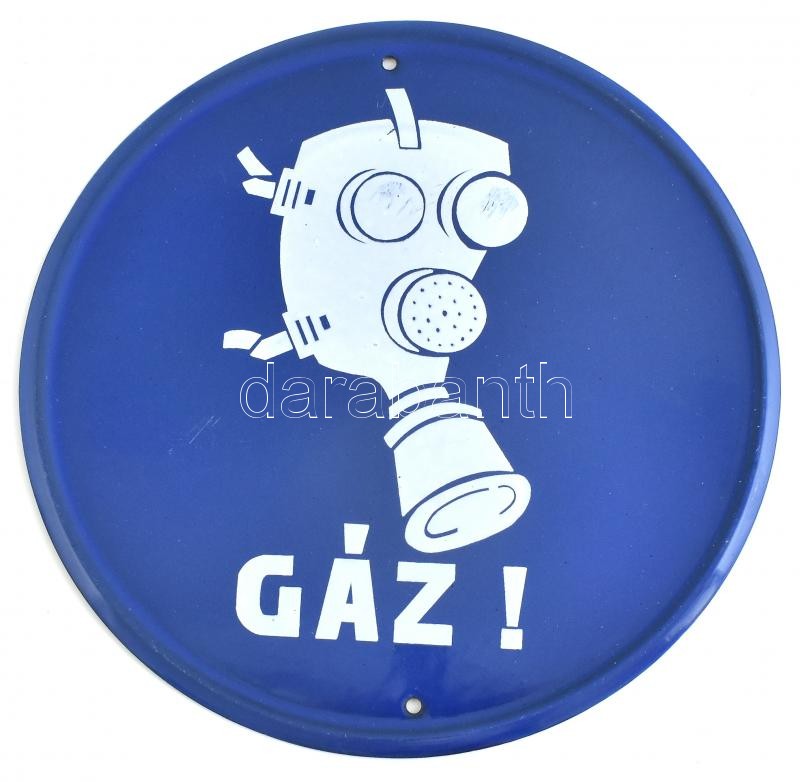 "Gáz!" zománcozott fém tábla, kopásnyomokkal, d: 25 cm