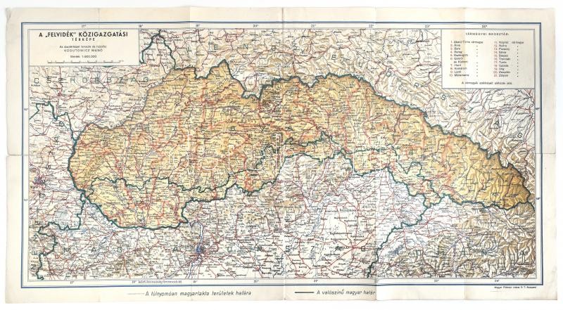 A "Felvidék" közigazgatási térképe, tervezte: Kogutowicz Manó, Magyar Földrajzi Intézet Rt., szakadással, 40×75 cm