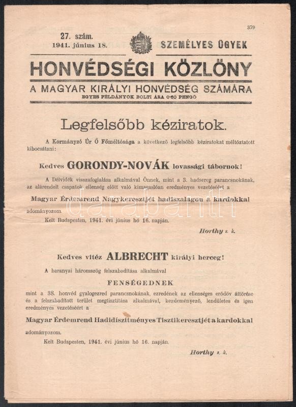 https://www.darabanth.com/en/403-Online-auction/403.0/Art-and-other-collectibles/Military~500032/1941-Honvedsegi-Kozlony-a-Magyar-Kiralyi-Honvedseg-szamara-27-szam-benne-erdemrend-ado~II2479737