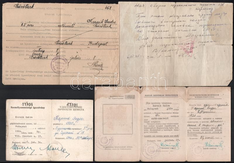 1945 Karnik Endre honvédelmi minisztériumi autószerelő kétnyelvű igazolványai + egyéb igazolványok