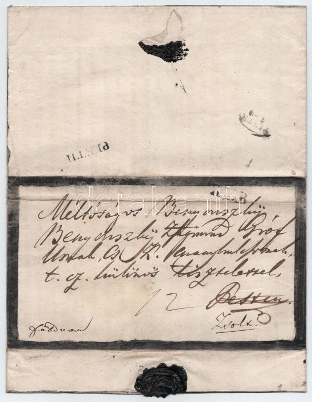 Description: 1841 Sopron, rátki és salamonfai Barthodeiszky János (1756-1841) cs. és kir. udvari tanácsos gyászjelentése, gróf Benyovszky Zsigmond (1798-1873) részére címezve, viaszpecséttel