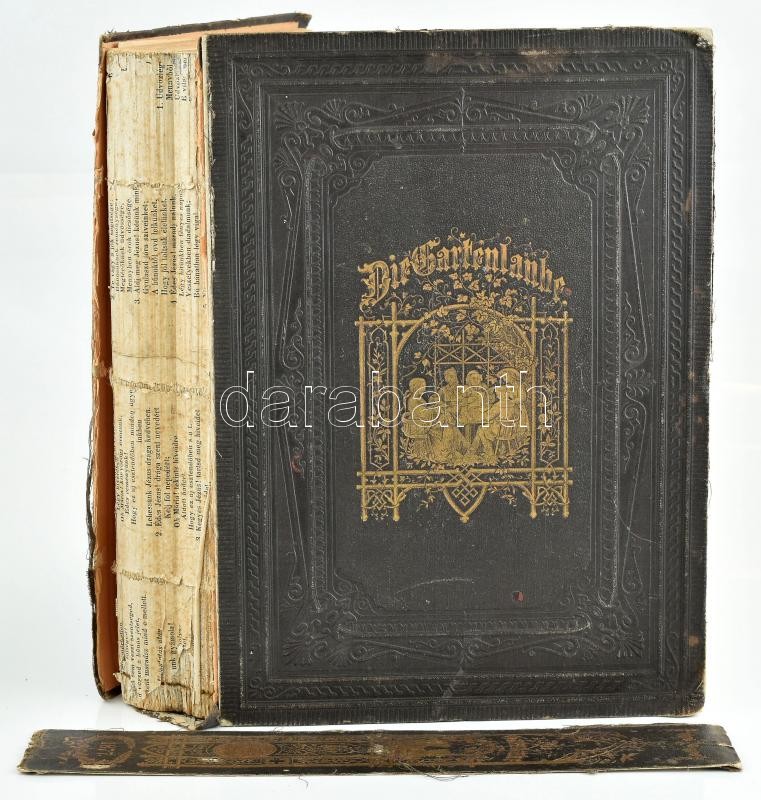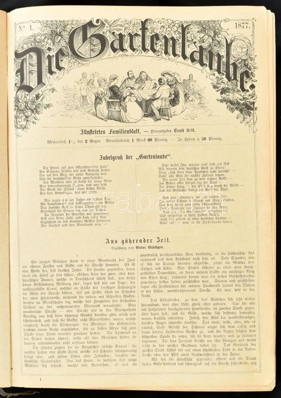 1877 Die Gartenlaube - Illustrirtes Familienblatt német nyelvű folyóirat 1877. évi teljes évfolyama egybekötve, acélmetszetű, fekete-fehér illusztrációkkal. Sérült, díszes, aranyozott, dombornyomott egészvászon-kötésben, a borítótól elvált gerinccel, helyenként sérült lapszélekkel, néhány kijáró lappal, 882+VI p.
