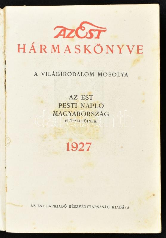 1930 Az Est hármaskönyve I-III. köt. (I. köt.: A férfi, II. köt.: A nő, III. köt.: A gyermek.) Kopott, foltos papírkötésekben, sérült, szétszakadt kartontokkal, a nő fordított kötéssel, a gyermek első lapja hiányzik és gerince sérült. + 1926-1927 Az Est hármaskönyvének 1-1 száma, kopott papírkötésekben, kissé szakadt borítókkal, az 1927-es borítója részben elvált a borítótól>