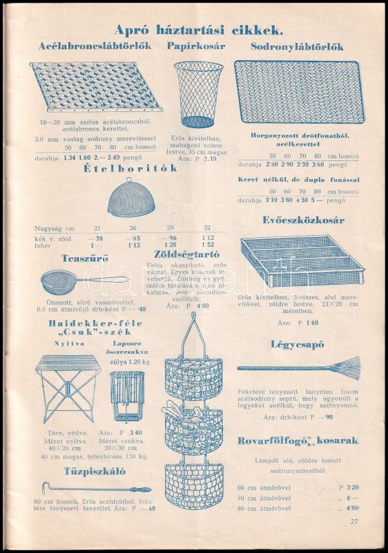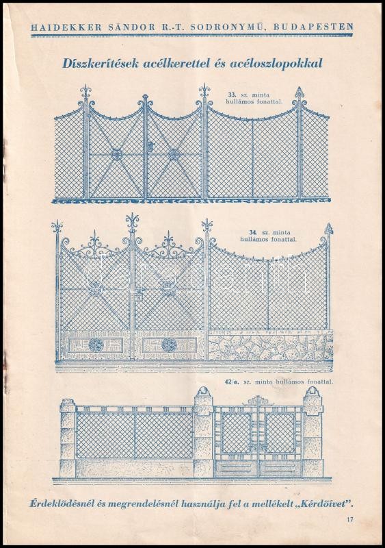 1939 Haidekker Sándor Rt. Budapest Sodronymű kerítés és egyéb ipari, használati cikkek rajzos árjegyzéke, szép állapotban, 32p