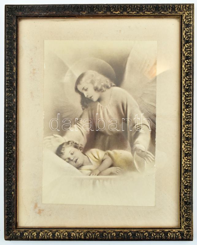 cca 1920 Őrangyal, kartonra ragasztott kép, üvegezett keretben, 24×16 ...
