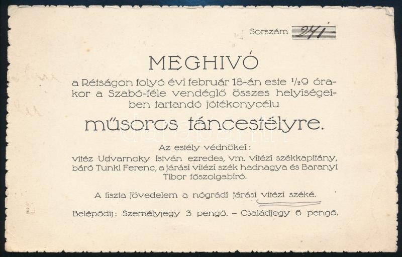 cca 1938 Vitézi szék meghívója rétsági táncestélyre