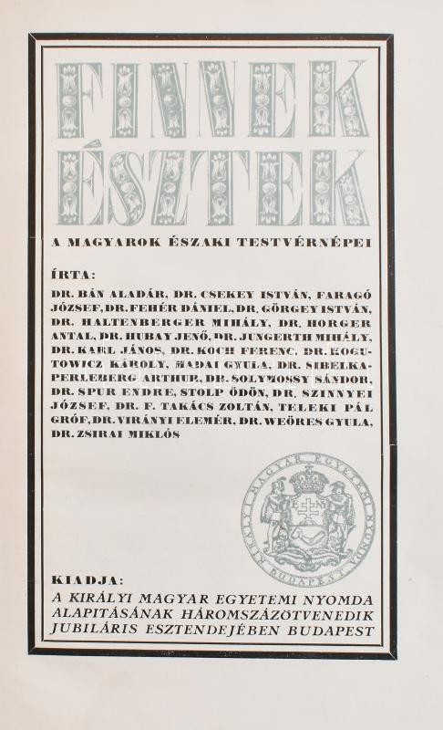 Finnek, észtek. A magyarok északi testvérnépei. Írták: Dr. Kogutovicz Károly, Dr. Szinnyei József, Teleki Pál, Dr. Zsirai Miklós és mások. Bp.,1928, M. Kir. Egyetemi Nyomda. Kiadói kartonált papírkötés, kissé kopott borítóval, egyébként jó állapotban.
