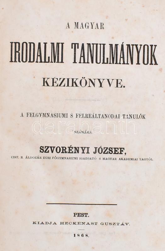Szvorényi József: A magyar irodalmi tanulmányok kézikönyve. A felgymnasiumi s felreáltanodai tanulók számára: - -. Pest, 1868, Heckenast Gusztáv, 2+453 p. + 1 t. KésÅ‘bbi átkötött félvászon-kötés, kissé kopott borÃtóval, kissé foltos lapokkal, benne újságkivágásokkal.